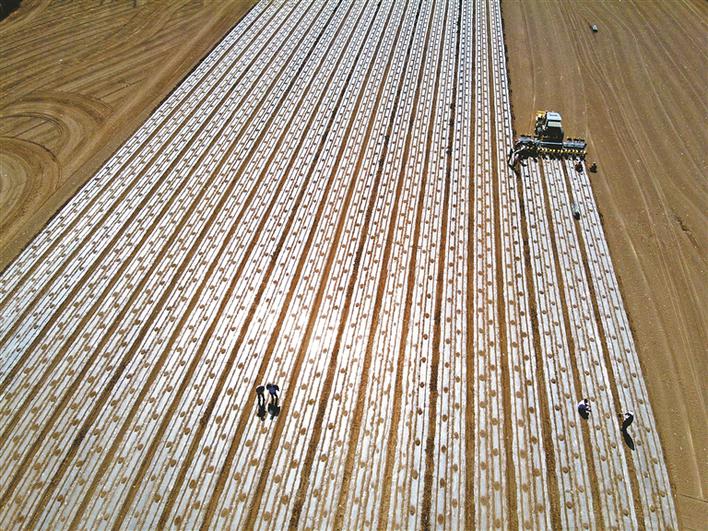 4月12日,一臺播種機在八師一四九團棉田里播種。今年,一四九團167臺(套)播種機全部安裝北斗導(dǎo)航自動駕駛系統(tǒng),精量播種技術(shù)得到全面推廣。