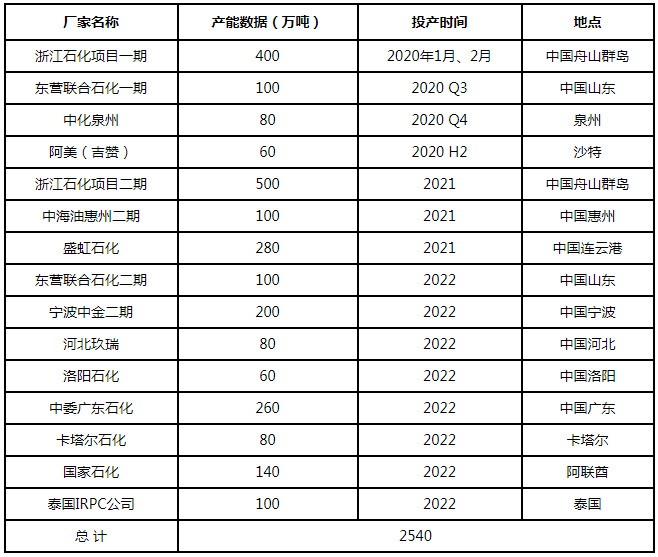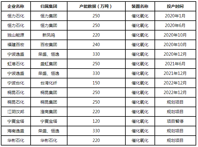 表2 2020-2022年中國PTA新增產(chǎn)能表