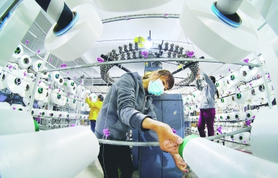 圖為近日,石獅新遠輝化纖紡織科技有限公司車間內(nèi),員工正在加緊生產(chǎn)。