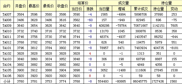 主力TA009合約當日交易走勢