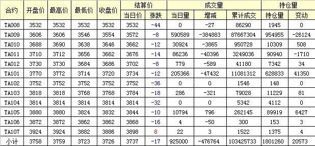 主力TA009合約當日交易走勢