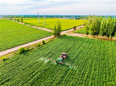近年來,呼圖壁縣大力推廣“智慧農(nóng)業(yè)+機械化管理”模式,通過GPS衛(wèi)星導(dǎo)航播種,植保無人機飛防,機械化中耕、噴灑農(nóng)藥、采收等作業(yè)方式,基本實現(xiàn)棉花從種到收的全程機械化。圖為7月28日,呼圖壁縣五工臺鎮(zhèn)幸福村,一臺大馬力拖拉機穿梭在棉田中噴灑農(nóng)藥。