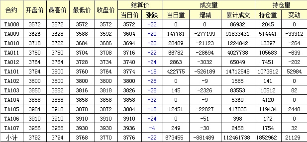 主力TA009合約當日交易走勢