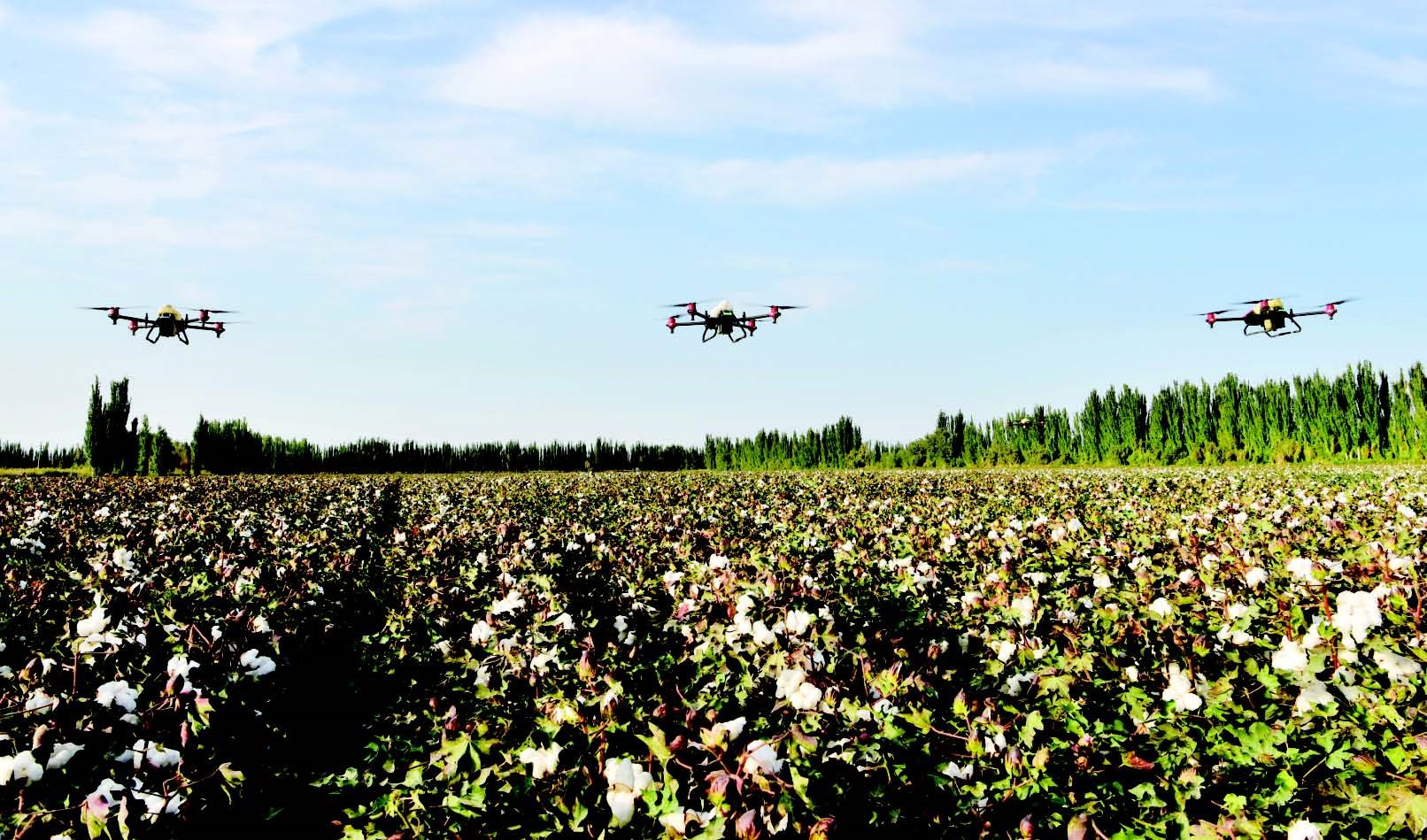 9月14日,在尉犁縣一處棉田里,無人機在噴施脫葉劑,為棉花采摘做準備。據(jù)悉,無人機作業(yè)不僅效率高,而且成本低,成為種棉大戶首選。