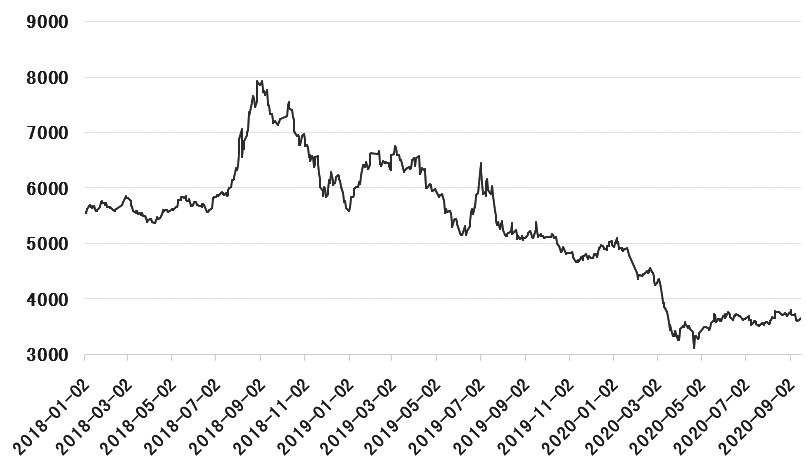 圖為PTA期貨主力合約走勢(單位:元/噸)