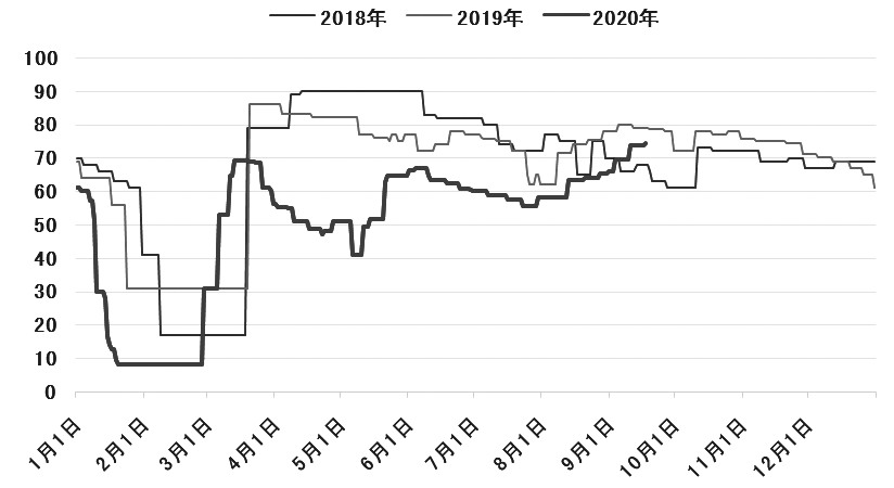 終端織造市場的恢復,提振了聚酯行業(yè),但受聚酯各品種庫存仍然偏高、利潤仍然偏低的影響,聚酯裝置開工提升幅度受限。截至9月17日聚酯裝置開工率87.79%,較2019年同期下降2.3個百分點。截至9月17日聚酯切片庫存天數(shù)14天,較2019年同期增加11天;滌綸短纖庫存天數(shù)4.6天,較2019年同期增加4.6天;滌綸長絲POY、FDY、DTY庫存天數(shù)分別18.8天、18.1天、35.1天,較2019年同期分別增加13.3天、9.1天、17.1天。截至9月18日聚酯切片加工利潤453.18元/噸,滌綸短纖加工利潤198.18元/噸,滌綸長絲POY、FDY、DTY加工利潤分別-371.83元/噸、-421.83元/噸、-271.83元/噸。