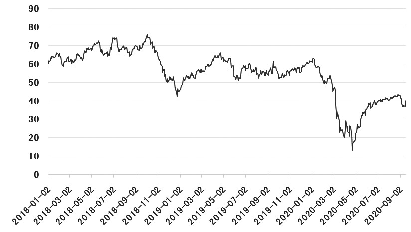 圖為WTI原油主力合約走勢(單位:美元/桶)