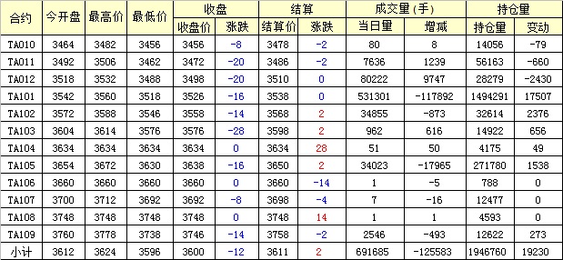 主力TA101合約當日交易走勢