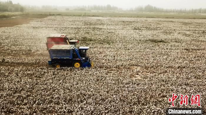 在新疆喀什地區(qū)巴楚縣,采棉機在棉田中來回穿梭進行機械化采收。