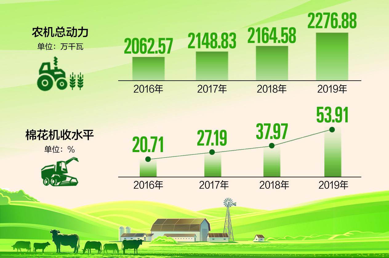 “十三五”以來,全區(qū)持續(xù)推進糧棉生產(chǎn)全程機械化和畜牧、林果、設施農(nóng)業(yè)等特色優(yōu)勢產(chǎn)業(yè)全面機械化進程,不斷提升農(nóng)業(yè)生產(chǎn)綜合效益。2016年至2019年,全區(qū)農(nóng)機總動力從2062.57萬千瓦增長至2276.88萬千瓦,農(nóng)林牧漁綜合機械化水平從66.04%提高至68.57%,機械化成為全區(qū)現(xiàn)代農(nóng)業(yè)發(fā)展的重要基礎和支撐。