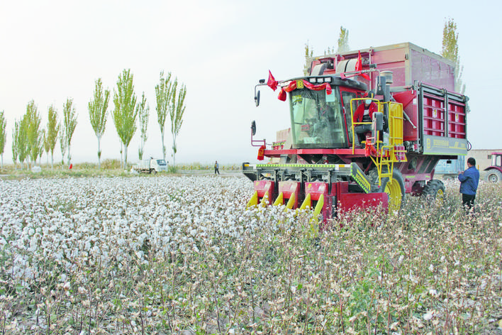 10月8日,柯坪縣啟浪鄉(xiāng)使用采棉機采收棉花。今年,柯坪縣加快推進農(nóng)機化進程,實現(xiàn)規(guī)?;r(nóng)田生產(chǎn)機械化作業(yè)。