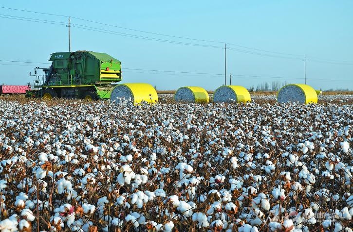 10月31日,采棉機(jī)在卸載棉包。兵團(tuán)第一師阿拉爾市200余萬(wàn)畝棉花喜獲豐收,雪白的棉花、湛藍(lán)的天空、忙碌的機(jī)車,構(gòu)成一幅豐收?qǐng)D景。