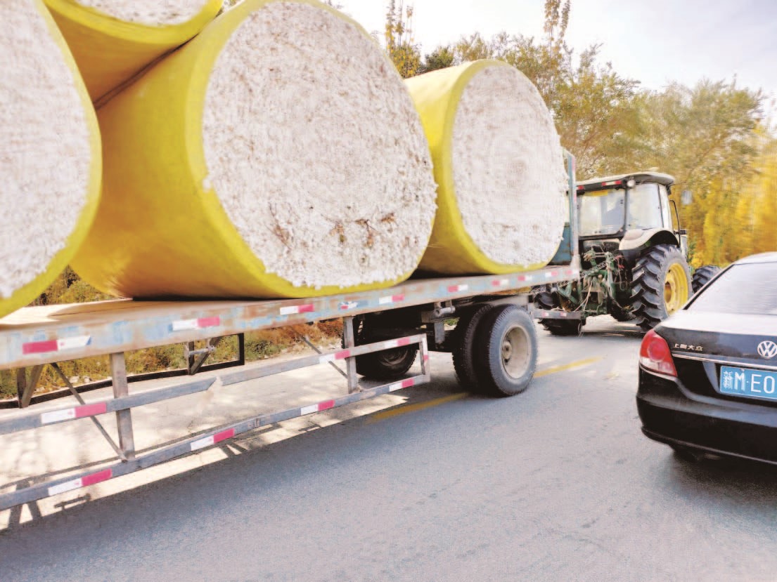 在尉犁縣阿克蘇普鄉(xiāng)的鄉(xiāng)村公路上,滿載機采棉圈的拖拉機正駛向當(dāng)?shù)氐能埢◤S。