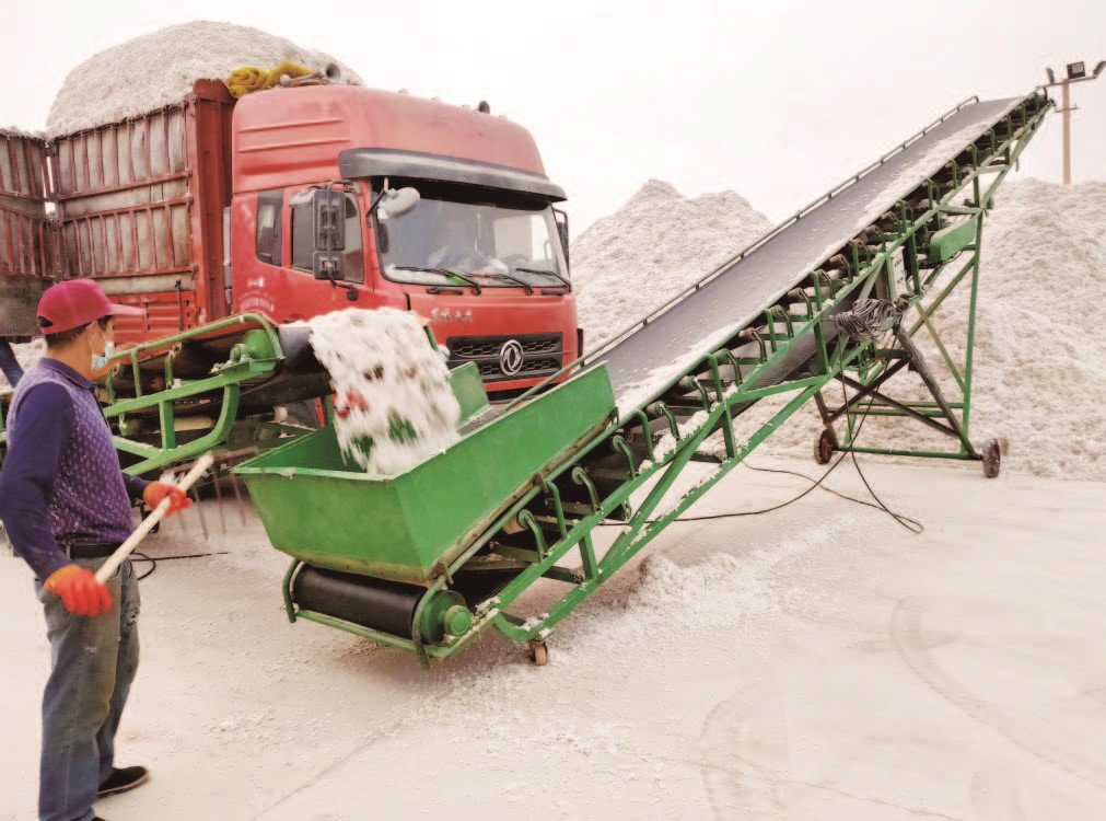 10月31日,在新疆閆氏德海農(nóng)業(yè)科技有限公司棉種加工大院里,工人正在收集棉花毛籽。