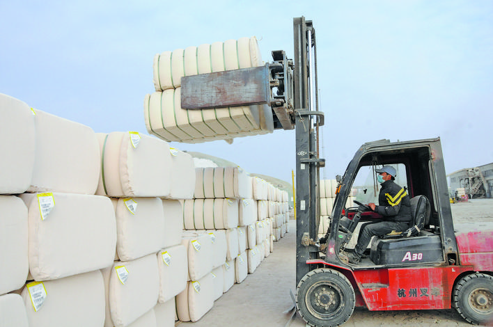 11月22日,新和縣益新棉業(yè)有限公司工作人員正在擺放生產(chǎn)好的皮棉。今年,新和縣82.7萬畝棉花喜獲豐收,農(nóng)民交售新棉后,棉花加工企業(yè)忙生產(chǎn)。