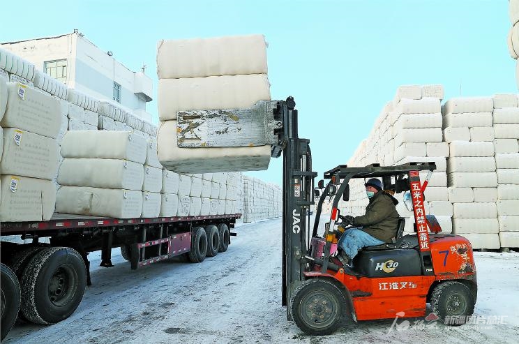 12月23日,工人在自治區(qū)棉麻公司烏魯木齊棉麻站轉(zhuǎn)運新棉。截至目前,該棉麻站出疆棉花已達(dá)35515噸。