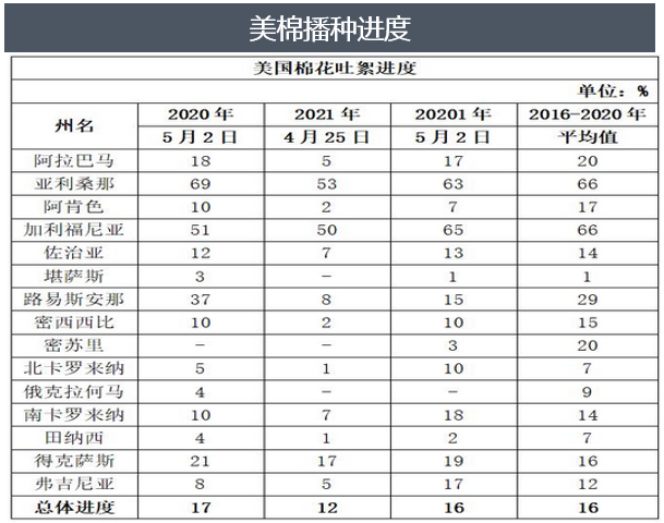 5月3日消息,美國農(nóng)業(yè)部(USDA)在報告中稱,截至5月2日當(dāng)周,美棉種植率為16%,前周為12%,去年同期為17%,5年均值為16%。美國主產(chǎn)棉區(qū)仍干旱,但預(yù)報顯示主產(chǎn)區(qū)西得州將迎來一些降雨,具體能否緩解旱情尚待觀察。
