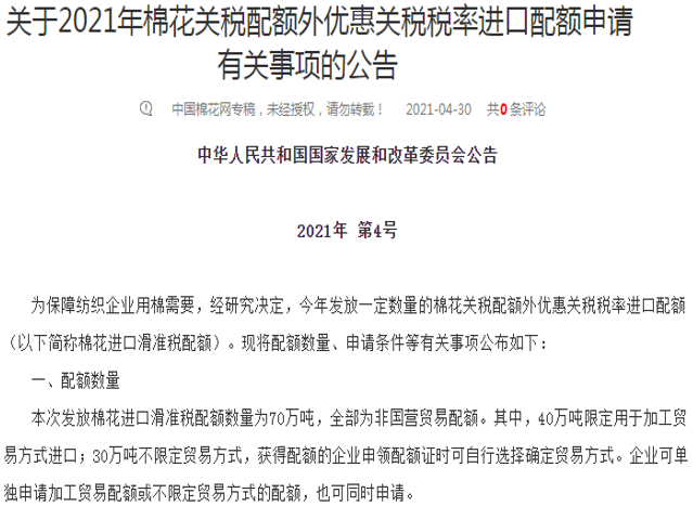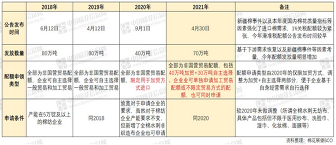 解讀:首先是此次實際發(fā)放數(shù)量70萬噸,因遠低于前期流傳的200萬噸。其次對于第七部分第二條的內(nèi)容“企業(yè)通過使用獲得的棉花進口滑準(zhǔn)稅配額進口的棉花由本企業(yè)加工經(jīng)營,不得轉(zhuǎn)賣?!标P(guān)稅配額中,國營貿(mào)易配額部分通關(guān)的棉花是可以進行貿(mào)易流通的,滑準(zhǔn)稅配額申請主體均為棉紡企業(yè)且全部為非國營貿(mào)易配額,這意味著這部分棉花只可自用。