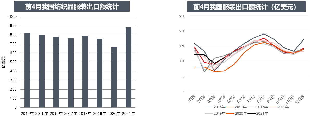 海關(guān)最新數(shù)據(jù)顯示,4月我國紡織品服裝出口232.77億美元,同比增加9%,其中紡織品出口121.55億美元、服裝出口111.23億美元。1-4月我國紡織品服裝出口883.78億美元,同比增加32.7%,其中紡織品出口439.56億美元,同比增加18%,服裝出口444.15億美元,同比增加51.7%。