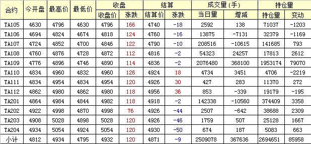 主力TA109合約當日交易走勢
