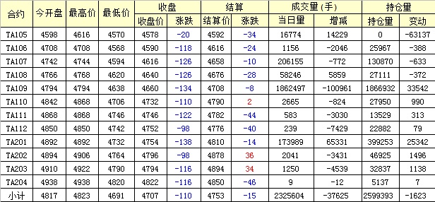 主力TA109合約當日交易走勢
