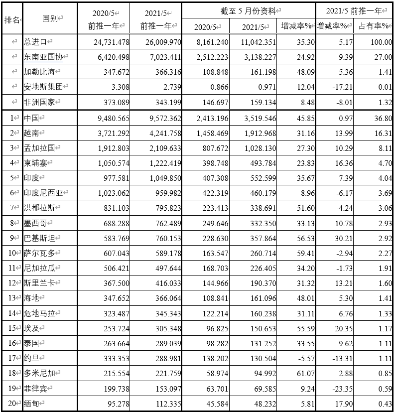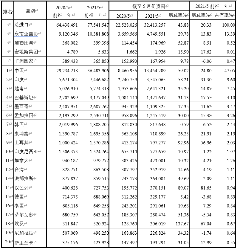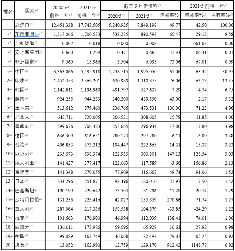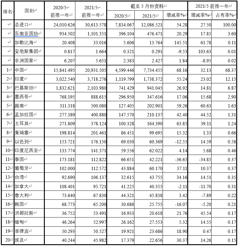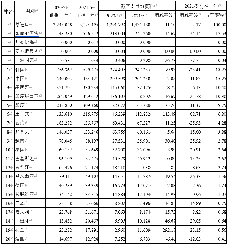 注:依2021年5月前推一年進(jìn)口占有率排序