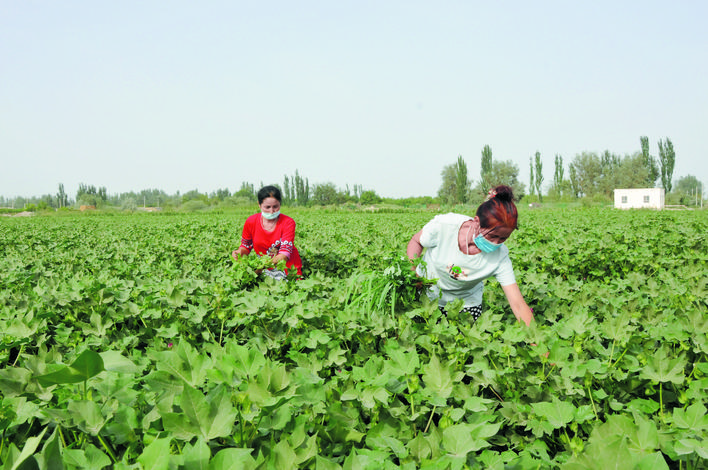 8月5日,沙雅縣海樓鎮(zhèn)阿克墩村農(nóng)民在管理棉花。