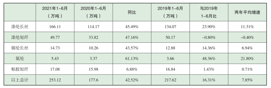 上半年,化纖行業(yè)總體開工負(fù)荷較2020年同期明顯提升,固然有2020年同期基數(shù)較低的因素,但和近幾年來同期水平相比也是處于高位。據(jù)國家統(tǒng)計局?jǐn)?shù)據(jù),1-6月化纖產(chǎn)量為3337萬噸,同比增加17.12%。為避免由于2020年低基數(shù)而造成的高增長對行業(yè)運(yùn)行態(tài)勢的誤判,我們以2019年上半年為基期,采用幾何平均法計算(下同),化纖產(chǎn)量兩年平均增速為9.10%。