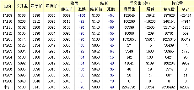主力TA109合約當日交易走勢