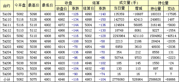 主力TA109合約當日交易走勢