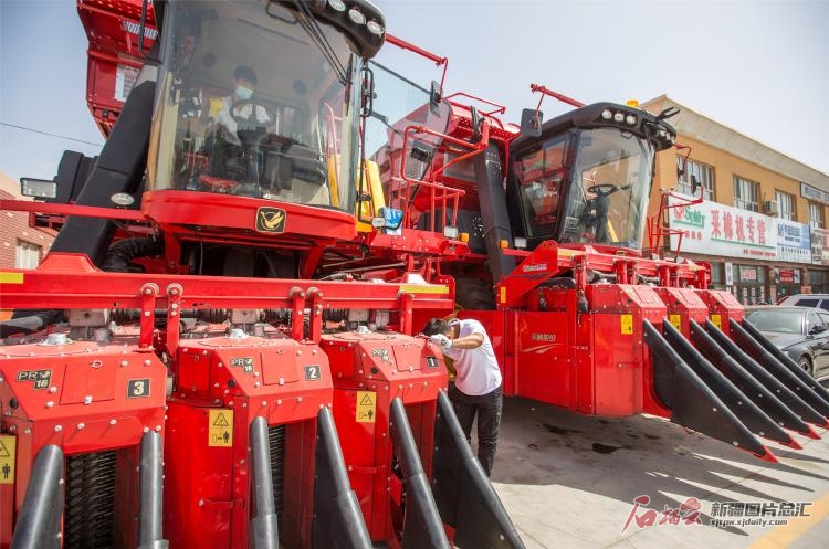 9月9日,農(nóng)技人員在庫(kù)車(chē)市惠民農(nóng)機(jī)綜合市場(chǎng)一家農(nóng)機(jī)銷(xiāo)售點(diǎn)對(duì)采棉機(jī)進(jìn)行檢測(cè)。庫(kù)車(chē)市155萬(wàn)畝棉花即將迎來(lái)采收季,各農(nóng)機(jī)銷(xiāo)售點(diǎn)、合作社加緊對(duì)采棉機(jī)械設(shè)備進(jìn)行全面檢測(cè)和調(diào)試,為棉花采收打好基礎(chǔ)。