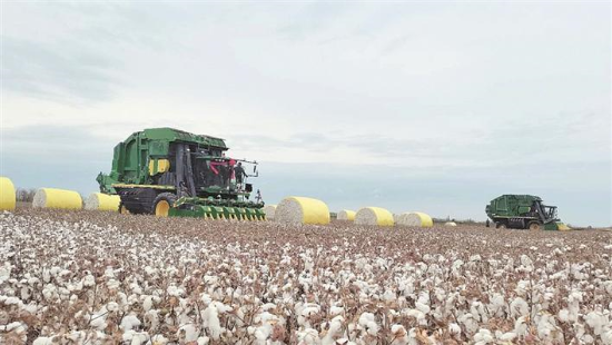 9月25日,在八師一四七團(tuán)五連一塊棉田里,2臺(tái)采棉機(jī)在田間穿梭作業(yè)。日前,一四七團(tuán)種植的15.8萬(wàn)畝棉花進(jìn)入采收期。