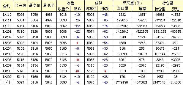 主力TA201合約當日交易走勢