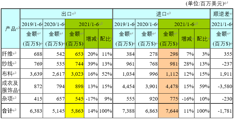 表一 2021年1-6月南韓紡織品及成衣出、進(jìn)口金額