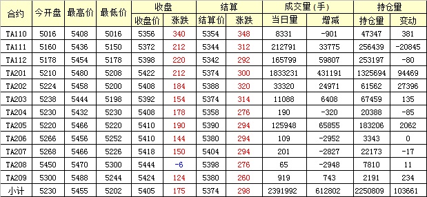 主力TA201合約當日交易走勢