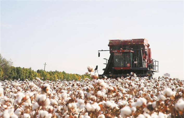 10月6日,一臺(tái)采棉機(jī)正在棉田里采收新棉。今年,十三師積極引導(dǎo)職工種植優(yōu)質(zhì)、早熟棉花新品種,做好脫葉劑噴施、采棉機(jī)檢修等準(zhǔn)備工作,為棉花豐產(chǎn)、棉農(nóng)增收奠定堅(jiān)實(shí)基礎(chǔ)。目前,該師21萬(wàn)余畝棉田全面進(jìn)入采收期。