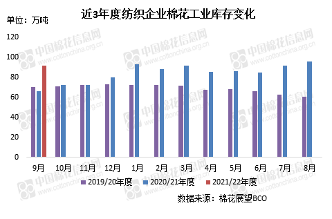 本月紡織下游需求不足,紡紗利潤有所下降,企業(yè)備貨積極性略有降低,原料庫存有所下降。截至9月30日,紡織企業(yè)在庫棉花工業(yè)庫存量91.42萬噸,較上月底減少4.13萬噸,同比增加25.56萬噸。其中32%企業(yè)減少棉花庫存,20%增加庫存,48%基本保持不變。