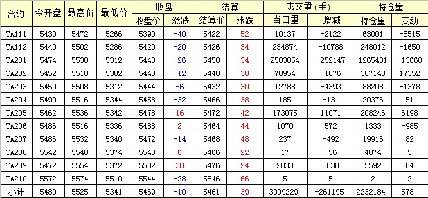 主力TA201合約當日交易走勢