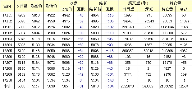 主力TA201合約當日交易走勢