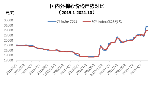 本月內(nèi)外棉紗價格上漲,國產(chǎn)32支純棉紗10月均價30226元/噸,較上月上漲3149元,漲幅11.6%,較去年同期上漲8558元,漲幅39.5%;進(jìn)口32支純棉紗10月均價28848元/噸,較上月上漲1630元,漲幅5.99%,較去年同期上漲7264元,漲幅33.7%。