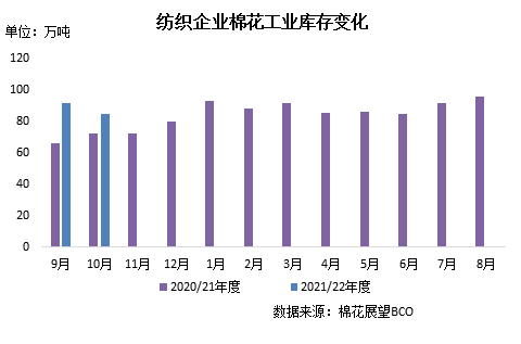 雖儲備棉輪出和進(jìn)口配額補(bǔ)充資源采購渠道,但本月棉價震蕩上行創(chuàng)新高,紡織企業(yè)采購意愿不高,原料庫存繼續(xù)下降。截至10月31日,紡織企業(yè)在庫棉花工業(yè)庫存量84.45萬噸,較上月底減少6.97萬噸,同比增加23.89萬噸。其中33%企業(yè)減少棉花庫存,20%增加庫存,47%基本保持不變。