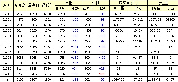 主力TA201合約當日交易走勢