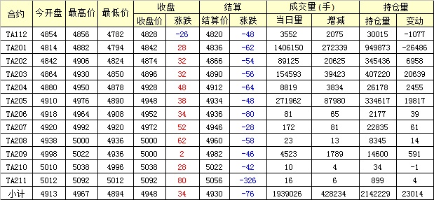 主力TA201合約當日交易走勢