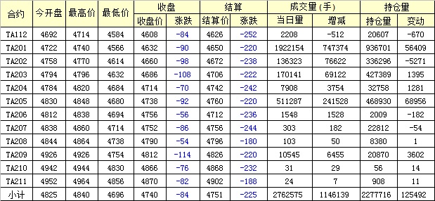 主力TA201合約當日交易走勢