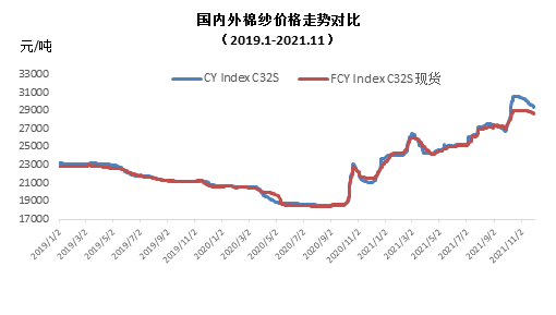 本月內(nèi)外棉紗價(jià)格有所分化,國內(nèi)下跌而進(jìn)口紗略有上漲。國產(chǎn)32支純棉紗11月均價(jià)29964元/噸,較上月下跌262元,跌幅0.87%,較去年同期上漲8621元,漲幅40.39%;進(jìn)口32支純棉紗11月均價(jià)28899元/噸,較上月上漲51元,漲幅0.18%,較去年同期上漲7203元,漲幅33.2%。