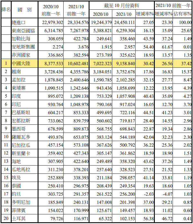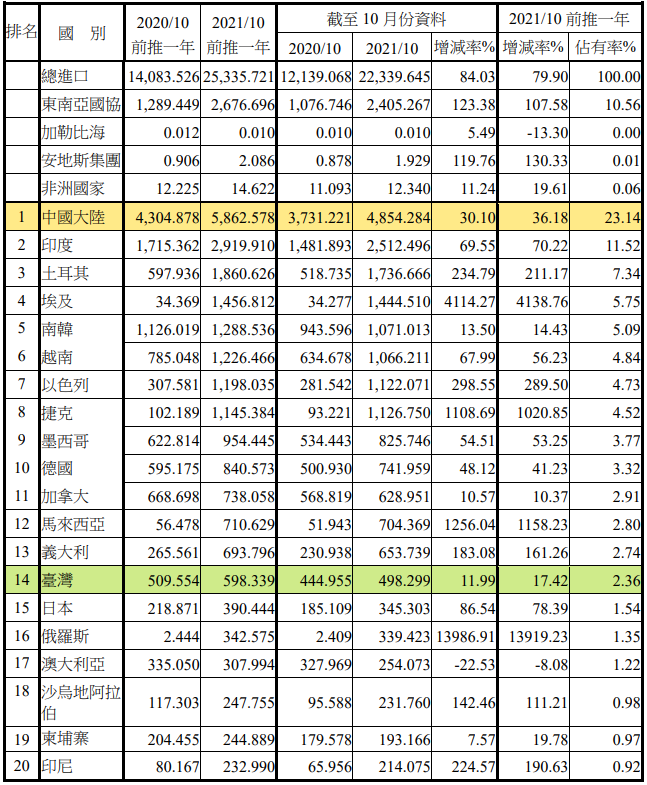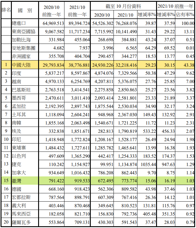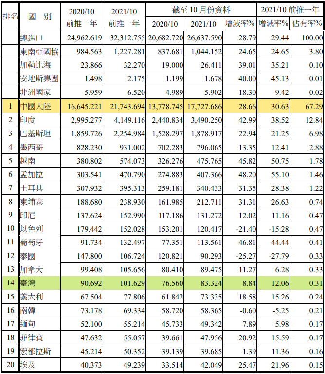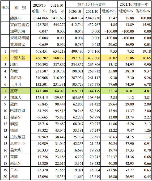 注:依2021年10月前推一年進(jìn)口占有率排序