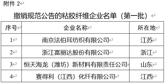 根據(jù)《粘膠纖維行業(yè)規(guī)范條件公告管理暫行辦法》有關(guān)規(guī)定,經(jīng)企業(yè)自主申報、省級工業(yè)和信息化主管部門核實推薦、專家組評審及征求生態(tài)環(huán)境部意見、對外公示等程序,現(xiàn)將符合《粘膠纖維行業(yè)規(guī)范條件(2017版)》企業(yè)名單(第三批)(附件1)和撤銷規(guī)范公告的粘膠纖維企業(yè)名單(第一批)(附件2)予以公告。