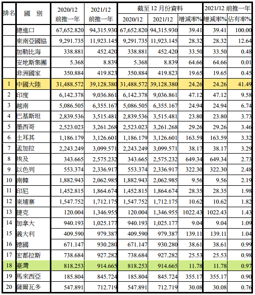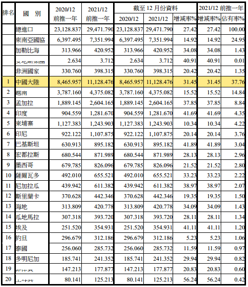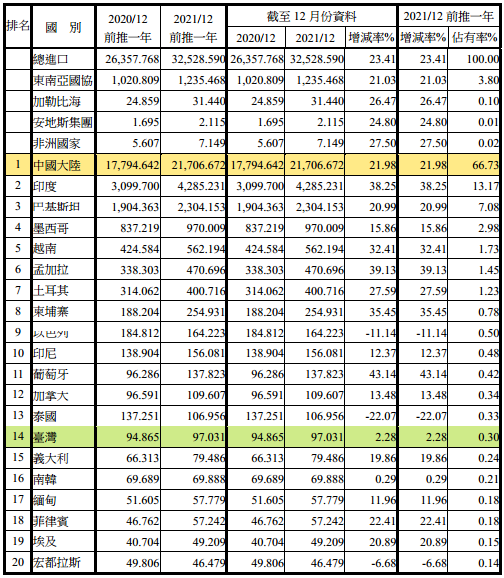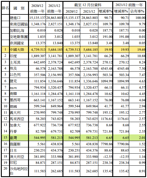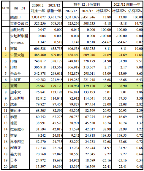 注:依2021年12月前推一年進(jìn)口占有率排序