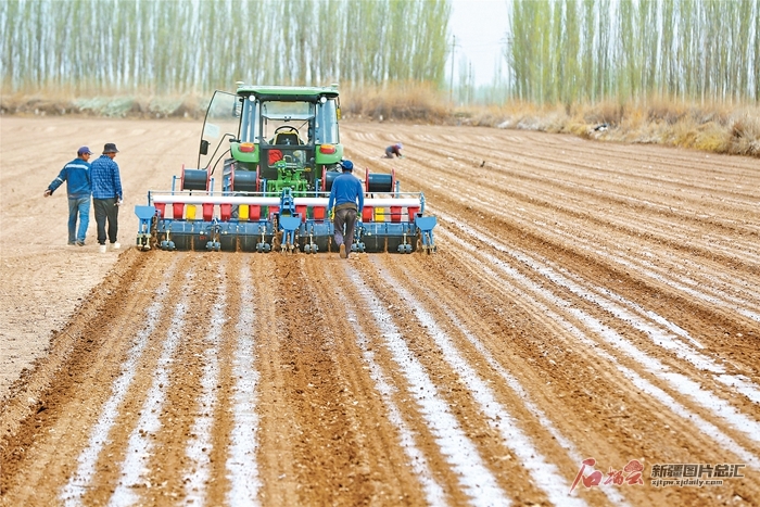 4月3日,棉農(nóng)在庫(kù)車(chē)市牙哈鎮(zhèn)晨光村棉田種植棉花。目前,庫(kù)車(chē)市164.4萬(wàn)畝棉花播種工作全面展開(kāi),田間地頭一派繁忙的春播景象。