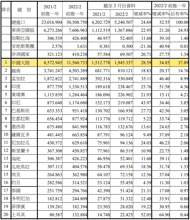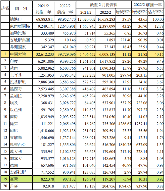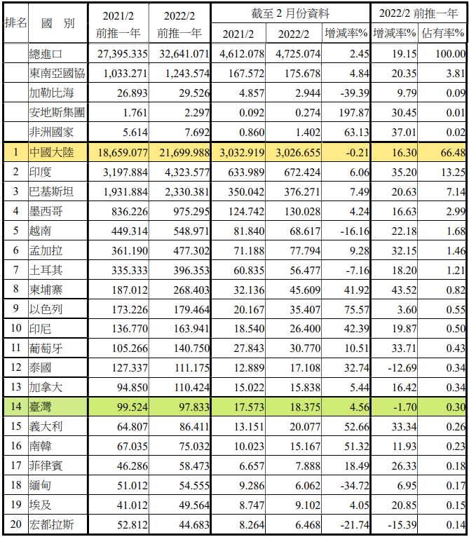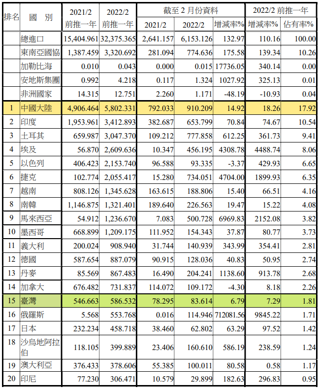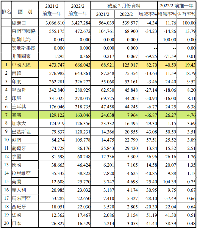 注:依2022年2月前推一年進(jìn)口占有率排序